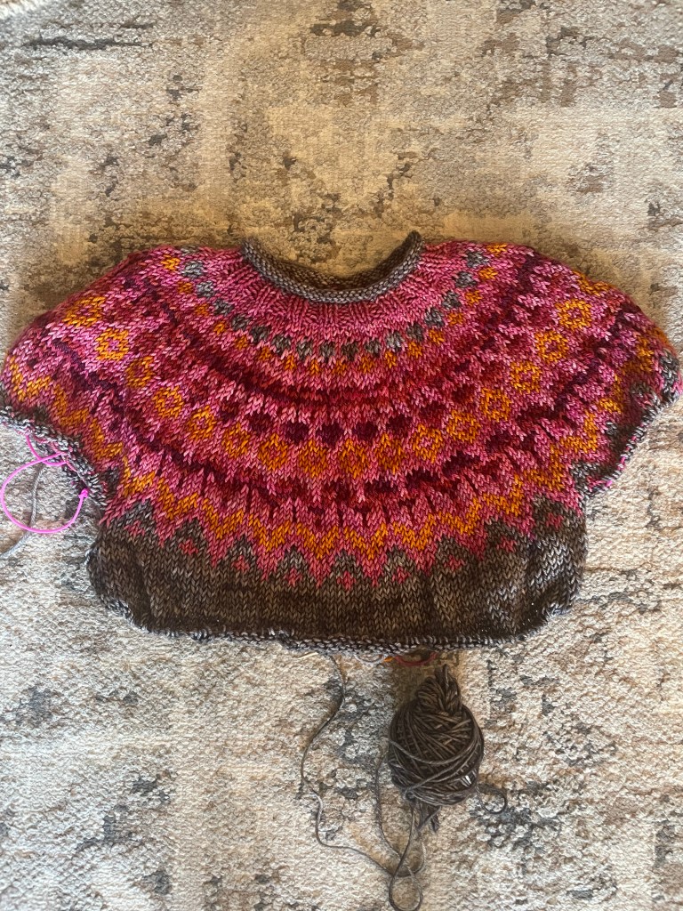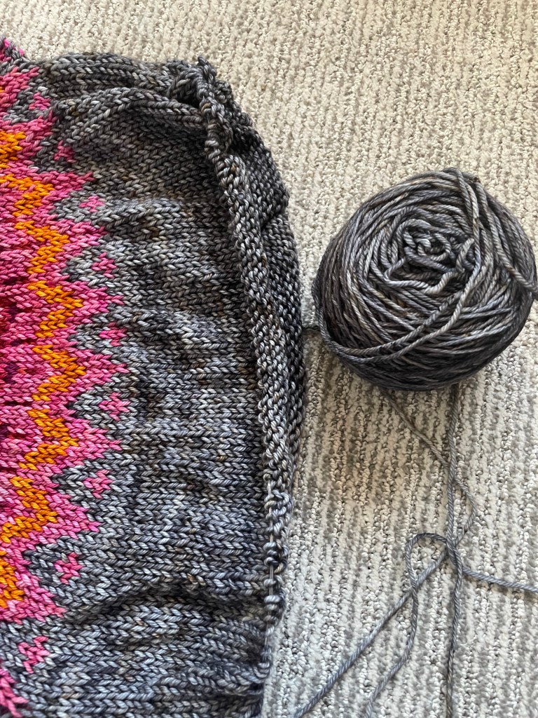 Partway through the body, I realized I was going to run out of my main color. The original yarn was from Mooncat Fiber, but the base color was actually dyed by Pink Adobe Dyeworks. They’re an independent yarn dyer based out of Nevada. I reached out to the dyer, and she couldn’t have been nicer. She offered to dye a new batch just for me and made sure it matched as close as possible. When the yarn arrived, not only was it beautiful and spot on, but she had also included the cutest little New Mexico-themed stitch marker. It was a thoughtful touch and made the whole experience feel really special.